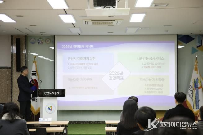 코리아타임뉴스 윤광희 기자 | 안산도시공사는 5일 2026년 시무식을 열고 시민 중심 서비스 확대를 핵심으로 한 새해 경영목표와 중점 추진 방향을 공유하며 새로운 한 해의 출발을 다짐했다.