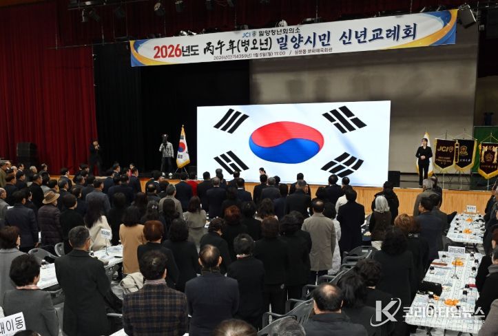 코리아타임뉴스 경남취재본부 | 밀양청년회의소(회장 김명증)는 5일 붉은 말의 해를 맞아 밀양시 삼문동 문화체육회관에서‘2026 병오년 신년교례회'를 개최했다.