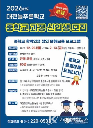 코리아타임뉴스 사회팀 | 대전평생학습관은 2026년 2월 13일까지 2026년 대전늘푸른학교 중학교 학력인정 과정 신입생을 모집한다고 밝혔다.