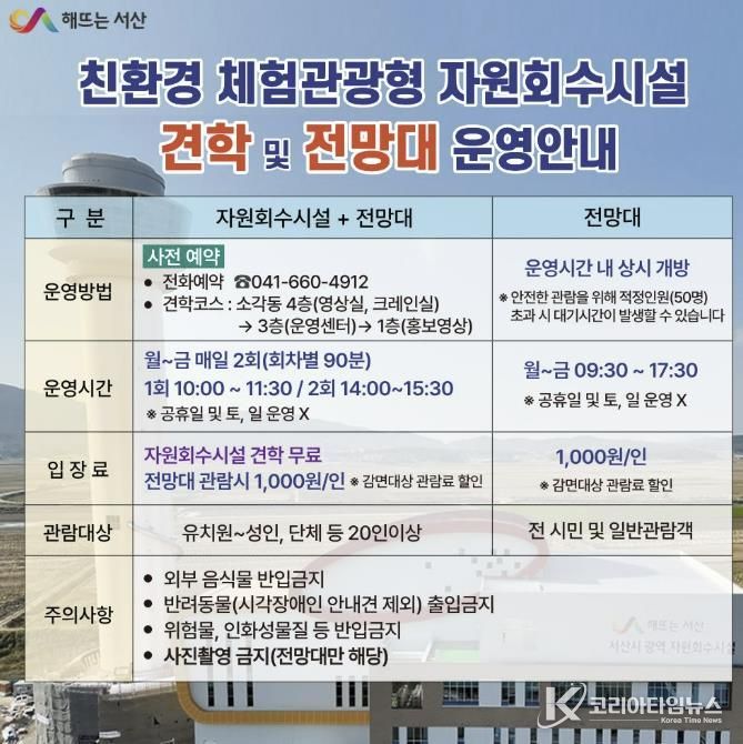 코리아타임뉴스 김택호 기자 | 충남 서산시는 지난 2일부터 친환경 체험관광형 자원회수시설 전망대를 본격 운영 중이라고 밝혔다.