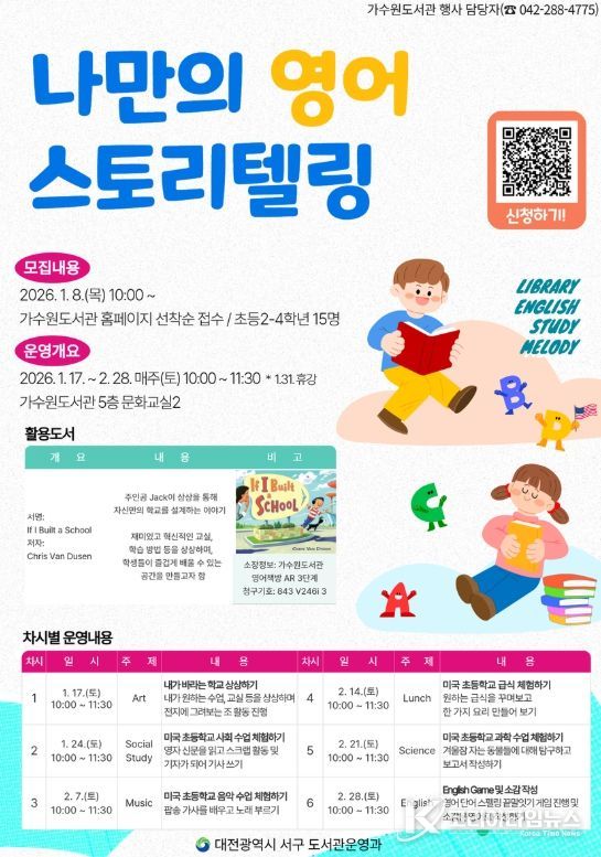 코리아타임뉴스 대전취재본부 | 대전 서구 가수원도서관은 초등학생 영어 원서 읽기 프로그램 ‘나만의 영어 스토리텔링’을 이달 17일부터 다음 달 28일까지 운영한다.