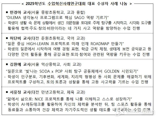 코리아타임뉴스 사회팀 | 교육부와 한국교육과정평가원(원장 직무대리 박은아)은 1월 7일, 엘타워(서울)에서 수상자와 교육청 관계자 등이 참석한 가운데 ‘2025학년도 수업혁신사례연구대회 시상식’을 개최한다.