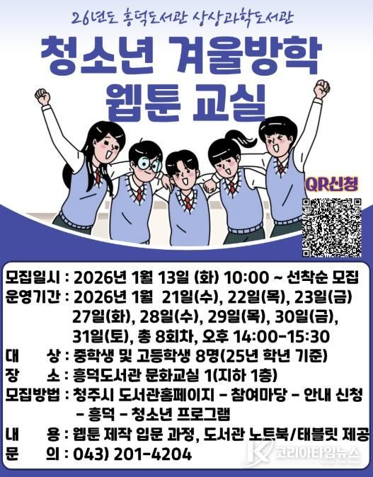 코리아타임뉴스 충북취재본부 | 청주흥덕도서관은 겨울방학을 맞은 청소년들의 창의력과 표현력을 키우기 위한 ‘청소년 겨울방학 웹툰 공작소’ 참가자를 모집한다고 8일 밝혔다.