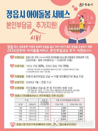 코리아타임뉴스 김태훈 기자 | 정읍시가 양육 공백이 발생한 가정의 경제적 부담을 획기적으로 낮추기 위해 팔을 걷어붙였다.
