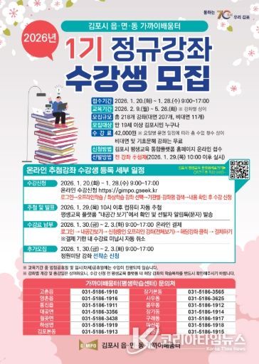 코리아타임뉴스 기동취재팀 | 김포시는 시민의 평생학습 참여 기회를 확대와 지역 밀착형 학습 환경 조성을 위해 2026년 읍면동 가까이배움터 제1기 수강생을 모집한다고 밝혔다.