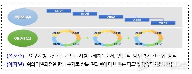 애자일(Agile) 개발은 짧은 주기로 소프트웨어를 반복 개발·배포하고 전력화 이후에도 성능을 지속 고도화할 수 있는 방식으로, 미국 국방부와 정보통신기업에서도 널리 활용되고 있다. 기존 폭포수(Waterfall) 방식은 장기간 일괄 개발 구조로 하드웨어 중심 무기체계 개발에 기여해왔으나, 인공지능(AI), 무인·로봇 등 소프트웨어 중심 첨단 무기체계의 신속하고 유연한 개발을 위해 애자일 방식을 새롭게 도입하게 됐다.