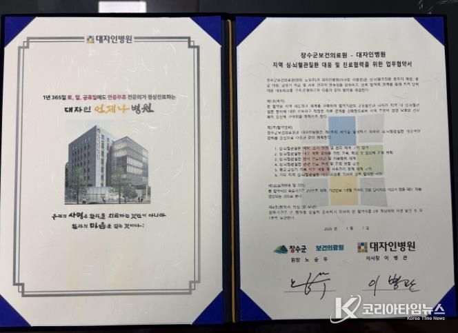 코리아타임뉴스 의료보건팀 | 장수군은 대자인병원과 심뇌혈관질환 발생 시 신속하고 효과적인 대응을 위해 상호 진료협력 체계를 구축하는 ‘심뇌혈관질환 대응 진료협력 협약(MOU)’을 체결했다고 9일 밝혔다.