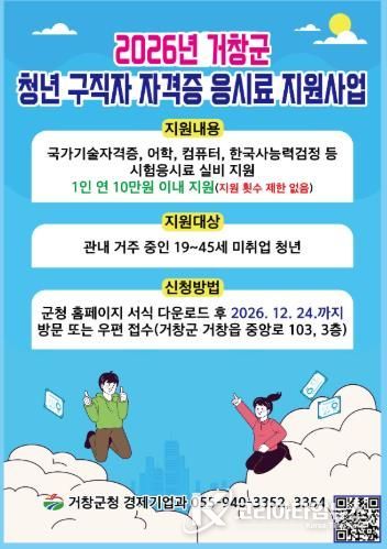 코리아타임뉴스 오영주 기자 | 거창군은 미취업 청년의 취업 역량 강화와 경제적 부담 완화를 위해 각종 자격증 시험 응시료를 지원한다.
