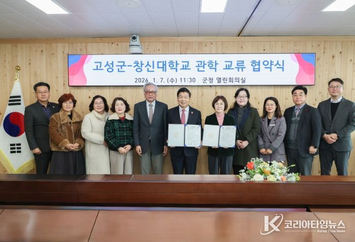 코리아타임뉴스 경남취재본부 | 고성군은 1월 7일, 군청 본관 3층 열린회의실에서 창신대학교와 디카시를 중심으로 한 관학 교류 협력 협약을 체결했다.