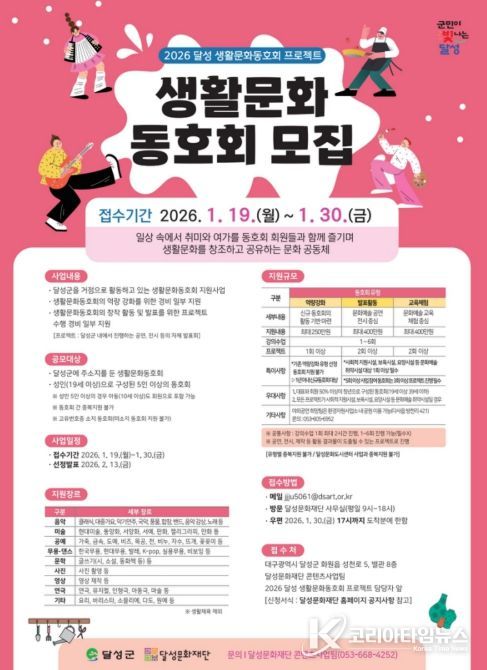 코리아타임뉴스 대구취재본부 | (재)달성문화재단은 1월 19일부터 30일까지 ‘2026 달성 생활문화동호회 프로젝트’에 참여할 동호회를 모집한다고 9일 밝혔다.