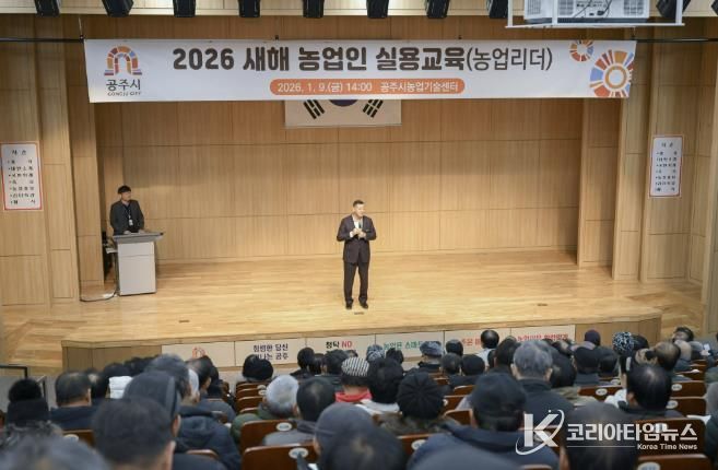 코리아타임뉴스 충남취재본부 | 공주시는 지난 9일 농업기술센터 대강당에서 이장과 농업인학습단체 임원 및 교육을 희망하는 농업인 등을 대상으로 2026년 새해 농업인 실용교육 ‘농업리더 특별과정’을 실시했다.