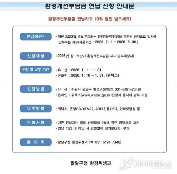 코리아타임뉴스 사회팀 | 수원시 팔달구는 환경개선부담금 납부 대상자를 대상으로 1월 31일까지 환경개선부담금 연납 신청을 받는다.