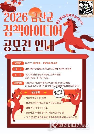 코리아타임뉴스 충남취재본부 | 금산군은 군정 전반에 대한 참신한 정책 아이디어를 발굴하고 군민과 함께 지역의 미래를 설계하기 위해 2026년 금산군 정책 아이디어 공모전을 개최한다.
