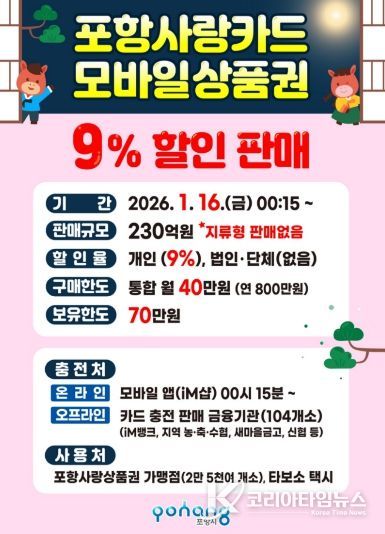 코리아타임뉴스 박찬식 기자 | 포항시는 오는 16일부터 2026년 카드형·모바일 포항사랑상품권(이하 포항사랑카드)의 첫 할인판매를 시작한다.