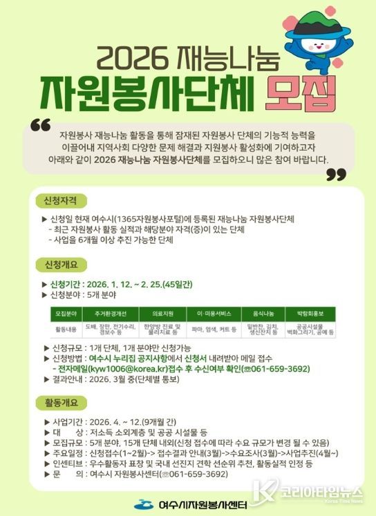 코리아타임뉴스 전남취재본부 | 여수시는 오늘(12일)부터 오는 2월 25일까지 ‘2026년 찾아가는 재능나눔 프로그램’에 참여할 자원봉사 단체를 모집한다.