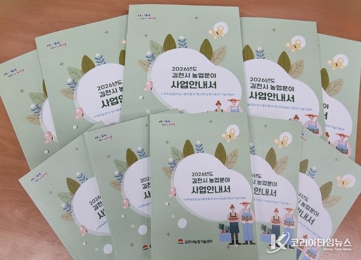 코리아타임뉴스 경북취재본부 | 김천시는 2026년도 김천시농업기술센터에서 추진하는 농업분야 지원사업의 사업내용과 신청정보를 담은 ‘2026년도 김천시 농업분야 사업안내서’를 제작하여 읍면동 행정복지센터 및 지역농협에 배포했다고 12일 밝혔다.