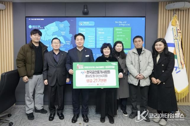 코리아타임뉴스 김택호 기자 | 한국공인중개사협회 충청남도도회 아산시지회는 12일 아산시(시장 오세현)를 방문해 지역 내 취약계층을 돕기 위한 성금 217만 원을 기탁했다.