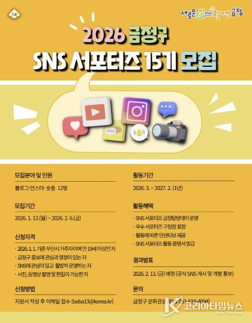 코리아타임뉴스 부산취재본부 | 부산시 금정구가 구민들과의 온라인 소통 확대를 위한 SNS 서포터즈를 모집한다.
