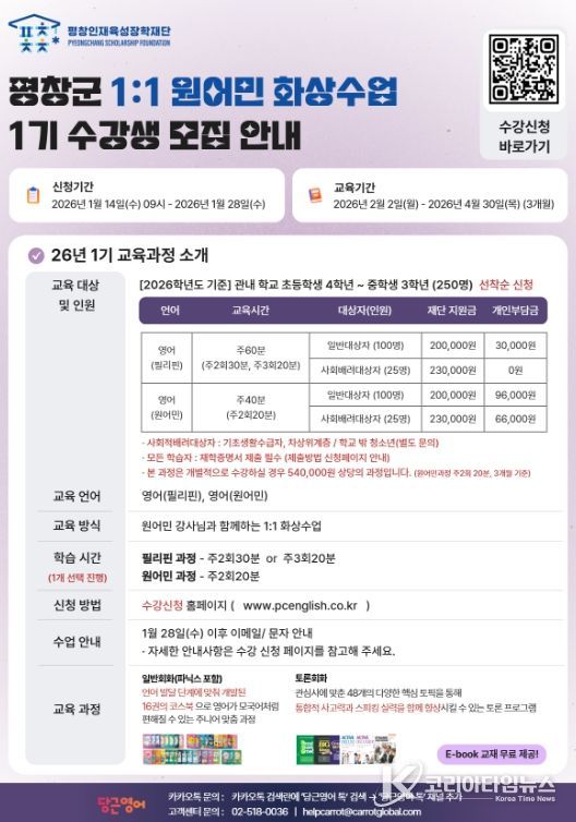 코리아타임뉴스 이아름 기자 | 재단법인 평창인재육성장학재단은 농촌지역의 지리적 한계를 넘어 수준 높은 어학 교육 환경을 제공하기 위해 오는 14일부터 28일까지‘2026 원어민 화상영어’ 참여자 모집에 나선다.