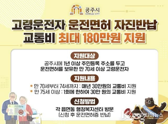 코리아타임뉴스 충남취재본부 | 공주시는 고령운전자의 운전면허 자진반납을 유도하기 위해 올해부터 교통비 지원금을 최대 180만 원까지 상향했다고 밝혔다.