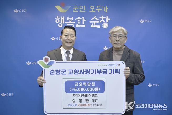 코리아타임뉴스 김태훈 기자 | 순창군은 12일 (주)대한에스엠피 설봉환 대표가 순창군에 고향사랑기부금 500만원을 기탁했다고 밝혔다.