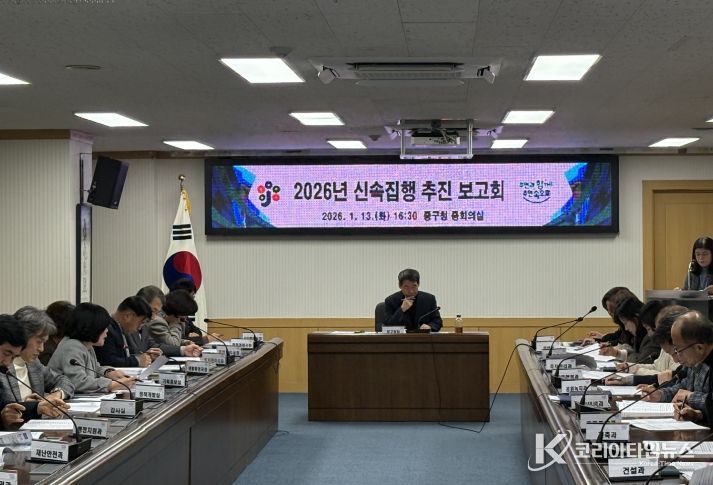 중구는 13일, 부구청장 주재로 ‘2026년 신속집행 추진 보고회’를 개최하고 전 부서의 신속집행 추진계획을 점검했다. 특히, 연초부터 집행이 차질 없이 진행될 수 있도록 1분기 내 행정절차를 집중적으로 추진하기로 했다.