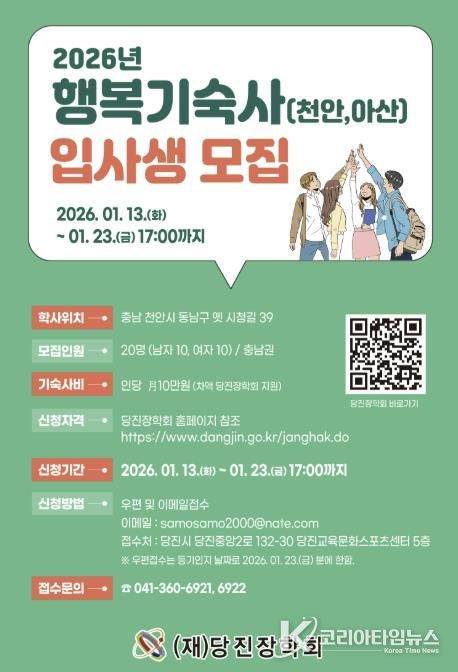 코리아타임뉴스 김택호 기자 | 당진시는 충남에 있는 대학을 다니는 당진시 대학생을 대상으로 2026년 천안 행복기숙사(동남구 소재) 입사생 20명을 모집한다고 14일 밝혔다.