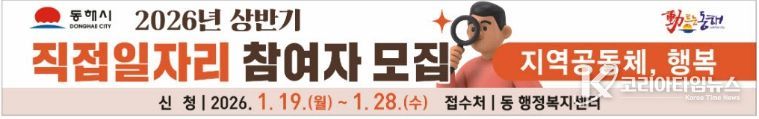코리아타임뉴스 이아름 기자 | 동해시는 취업 취약계층의 생계 안정을 돕고 지역경제에 활력을 불어넣기 위해 오는 19일부터 2026년 상반기 직접일자리사업 참여자 모집을 시작한다.