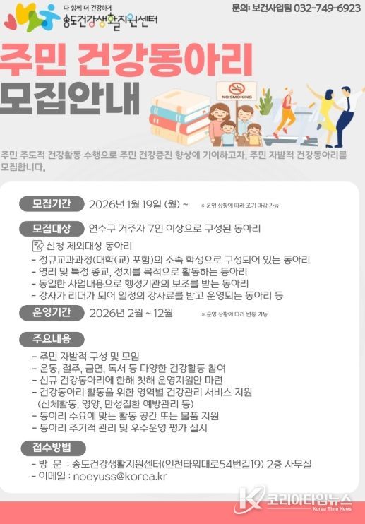 코리아타임뉴스 이아름 기자 | 연수구 송도건강생활지원센터는 주민들의 자발적인 건강 증진 활동을 지원하기 위해 오는 19일부터 ‘주민 참여형 건강동아리’를 모집한다.