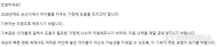 코리아타임뉴스 충남취재본부 | 논산의 새해를 매년 감동으로 물들인‘익명의 기부천사’가 올해도 어김없이 찾아왔다.