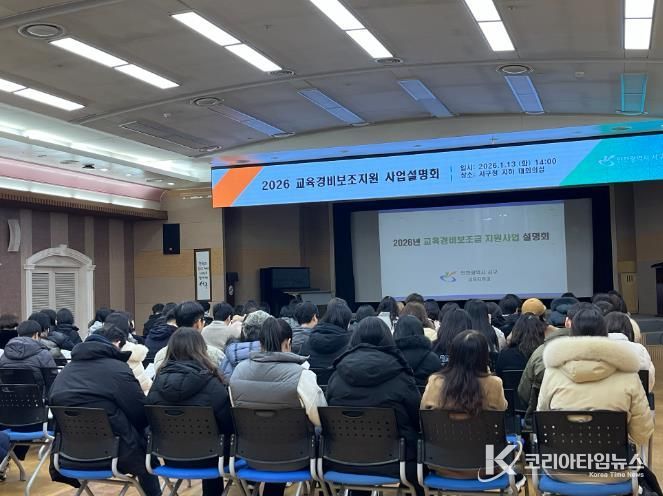 코리아타임뉴스 사회팀 | 인천광역시 서구는 2026년도 교육경비 보조지원 사업의 원활한 추진을 위해 관내 초·중·고·특수학교 교육경비사업 담당 실무자 84명이 참석한 가운데 ‘2026년 교육경비보조지원 사업설명회’를 개최했다.
