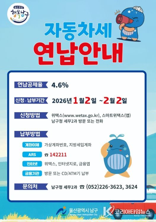 코리아타임뉴스 울산취재본부 | 울산 남구는 오는 2월 2일까지 올해 1월 자동차세 연납 신청을 접수한다고 밝혔다.