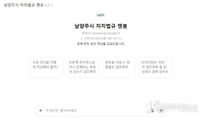 코리아타임뉴스 경기취재본부 | 남양주시는 이달부터 전 직원을 대상으로 자치법규 업무를 지원하는 생성형 인공지능(AI) 기반 ‘남양주시 자치법규 챗봇’ 운영을 시작했다고 14일 밝혔다.