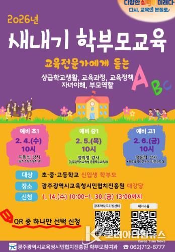 코리아타임뉴스 사회팀 | 광주시교육청시민협치진흥원은 오는 2월 4~6일 본원 대강당에서 초·중·고등학교 신입생 학부모를 대상으로 ‘2026년 새내기 학부모교육’을 운영한다.