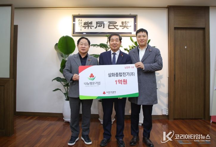 코리아타임뉴스 경기취재본부 | 남양주시는 14일 삼화종합전기가 사회복지공동모금회의 고액 기부 프로그램인 ‘나눔명문기업’ 5호로 가입하고, 지역 내 취약계층 지원을 위해 1억 원 기부를 약정했다고 밝혔다.