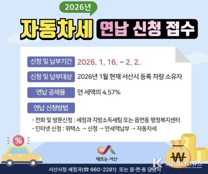 코리아타임뉴스 김택호 기자 | 충남 서산시는 2026년 자동차세 연납 신청을 2월 2일까지 접수한다고 밝혔다.