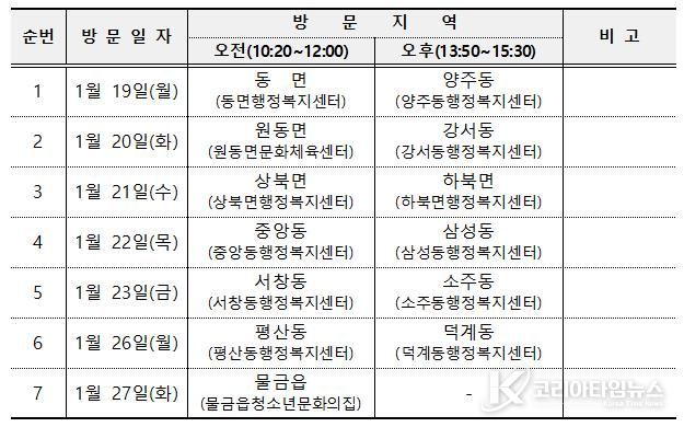 읍·면·동별 일정은 19일 동면(오전)·양주동(오후)을 시작으로, 20일 원동면(오전)·강서동(오후), 21일 상북면(오전)·하북면(오후), 22일 중앙동(오전)·삼성동(오후), 23일 서창동(오전)·소주동(오후), 26일 평산동(오전)·덕계동(오후)을 거쳐, 27일 물금읍(오전)에서 마무리될 예정이다.