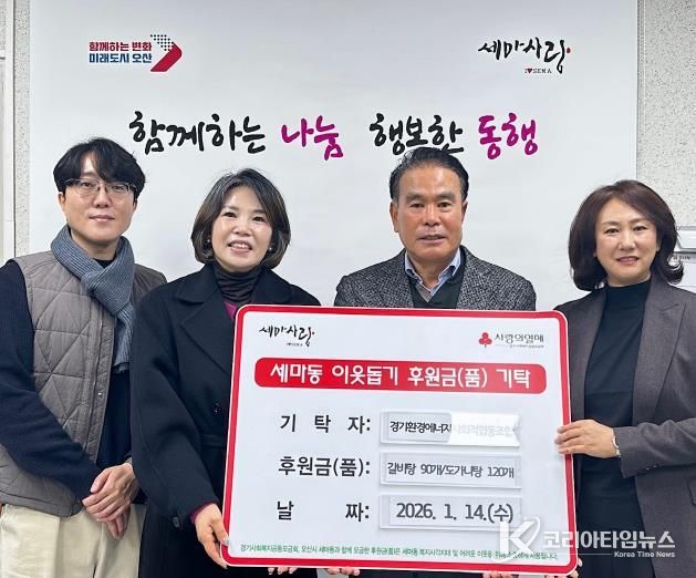 코리아타임뉴스 윤광희 기자 | 오산시 세마동 행정복지센터는 지난 14일 경기환경에너지사회적협동조합으로부터 관내 위기이웃 지원을 위한 갈비탕 90개와 도가니탕 120개 등 약 100만 원 상당의 후원 물품을 기탁받았다고 밝혔다.