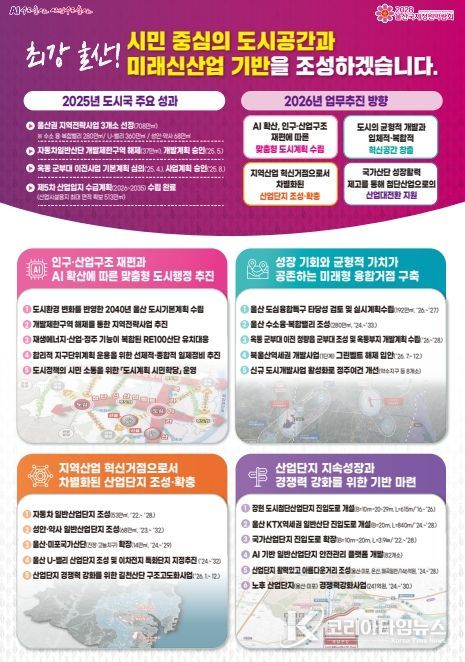 코리아타임뉴스 울산취재본부 | 울산시가 ‘최강 울산!’ 완성을 위한 시민 중심의 도시공간 조성과 미래 신산업 기반 구축을 목표로 2026년 도시 분야 정책을 추진한다.