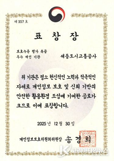 코리아타임뉴스 세종취재분부 | 세종도시교통공사(사장 도순구)는 개인정보보호위원회가 주관한 ‘2024년 공공기관 개인정보 보호수준 평가’에서 ‘우수 개선 기관’으로 선정되어 위원장 표창을 받았다고 밝혔다.