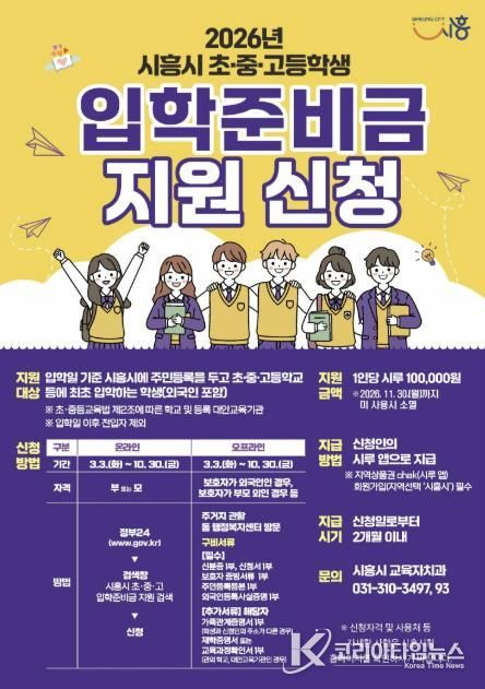 코리아타임뉴스 경기취재본부 | 시흥시는 올해부터 관내 초중고 입학 자녀 가정에 입학준비금을 10만 원씩 지원한다. 이번 지원은 도서나 문구류 등을 새로 마련해야 하는 신입생 가정의 경제적 부담을 줄여주고, 교육 기본권을 강화하고자 추진됐다.