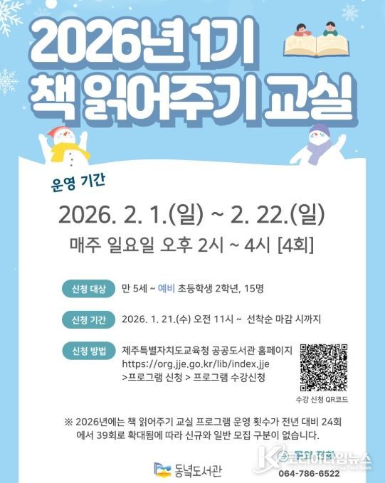 코리아타임뉴스 사회팀 | 제주도교육청 동녘도서관은 2월 1일부터 22일까지 평생교육실에서 유아 및 저학년 어린이의 독서 흥미와 창의력 향상을 위한 ‘2026년 1기 책 읽어주기 교실’을 운영한다.