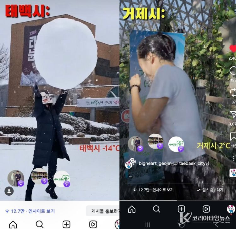 코리아타임뉴스 경남취재본부 | 거제시가 태백시와 협업해 제작한 홍보 영상이 인스타그램에서 게시 하루만에 조회수 10만회를 돌파하며 큰 관심을 받고 있다.