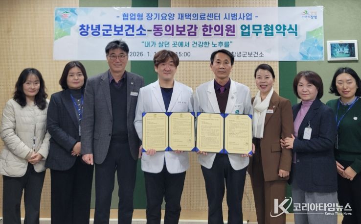 코리아타임뉴스 경남취재본부 | 창녕군은 지난 14일 동의보감 한의원과 장기요양 재택의료센터 시범사업 운영을 위한 업무협약(MOU)을 체결하고, 지역 내 의료 취약계층을 대상으로 한 재택의료 서비스를 본격 추진한다고 밝혔다.