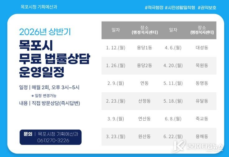 코리아타임뉴스 전남취재본부 | 목포시는 시민의 법률 접근성을 높이고 생활 속 법률 문제 해결을 지원하기 위해 찾아가는 ‘무료 법률상담’을 올해도 지속적으로 운영한다.