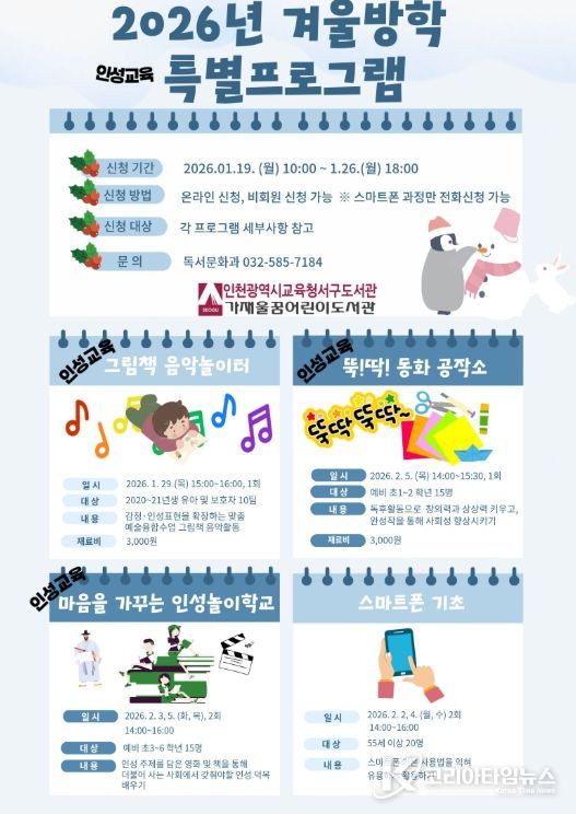 코리아타임뉴스 사회팀 | 인천광역시교육청서구도서관은 ‘2026년 겨울방학 특별프로그램’ 학습자를 19일 오전 10시부터 선착순으로 모집한다.