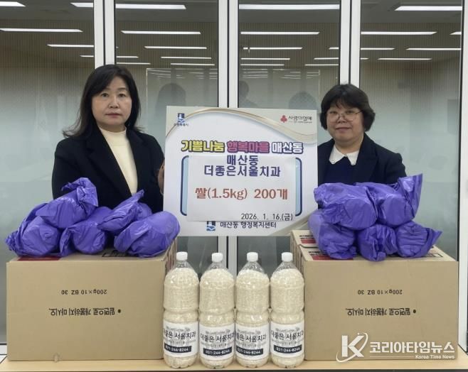 코리아타임뉴스 사회팀 | 수원시 팔달구 매산동은 지난 16일, 매산동 관내에 소재한 더좋은서울치과에서 지역 내 어려운 이웃을 돕기 위해 페트병 쌀 200개를 매산동 지역사회보장협의체에 후원했다고 밝혔다.