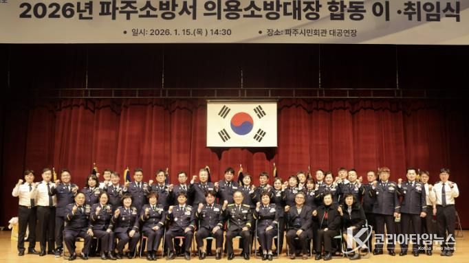코리아타임뉴스 김태훈 기자 | 파주소방서는 1월 15일 파주시민회관 대공연장에서 『2026년 파주소방서 의용소방대 대장 합동 이·취임식』을 열고, 지역 안전을 위해 헌신해온 이임 대장들의 공로에 감사를 전하는 한편, 새로운 리더들과 함께 ‘의용’의 사명을 이어갈 뜻을 다졌다.