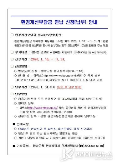 코리아타임뉴스 오영주 기자 | 함양군은 경유를 연료로 사용하는 자동차(2012년 3월 이전 제작·등록에 한함)에 매년 3월과 9월 부과되는 환경개선부담금의 일시 납부(연납)를 1월 31일까지 접수 받고 있다.