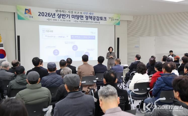 코리아타임뉴스 경기취재본부 | 안성시 미양면은 지난 1월 15일, 미양면행정복지센터 대회의실에서 주민 120여 명이 참석한 가운데 ‘2026년 상반기 미양면 정책공감토크’를 성황리에 개최했다.